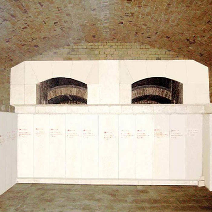 バッチ材料を溶融し、ガラス液を清澄化および均質化する部分です。溶融部の上の空間は火炎空間と呼ばれ、下部は溶融槽です。火炎はバーナーからポートを通り、予熱された空気が供給されます。